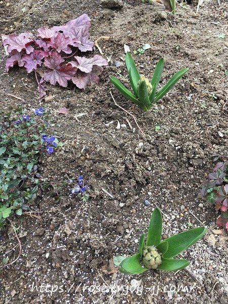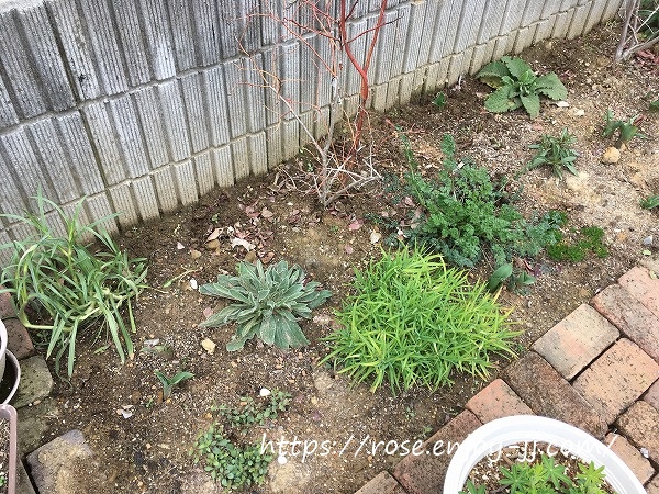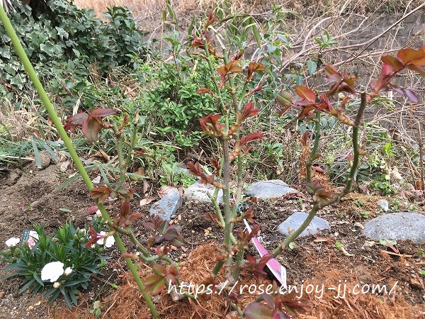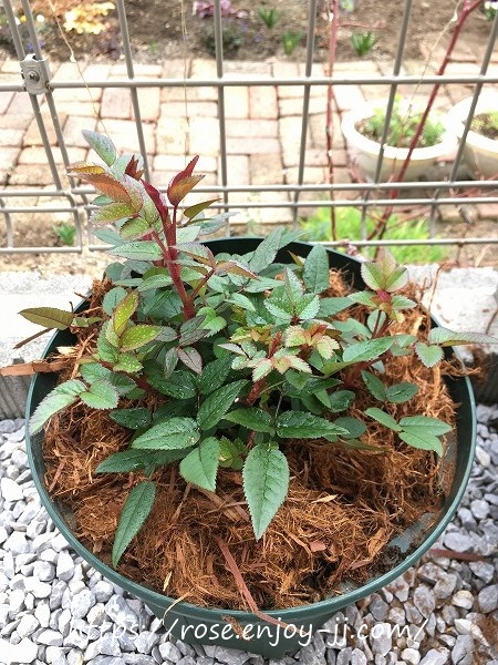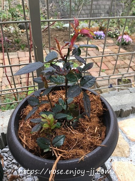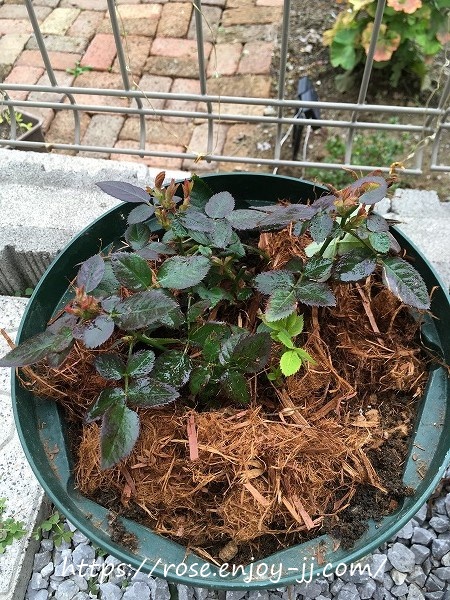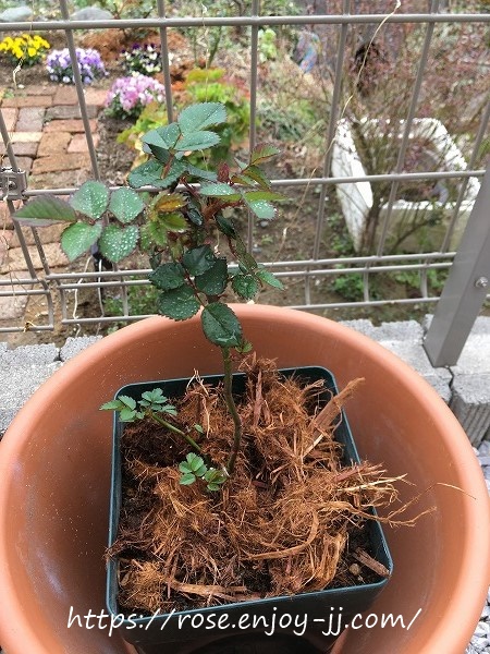 地植えよりも、写真下右のバラ用土の鉢植え苗が元気いっぱい♪