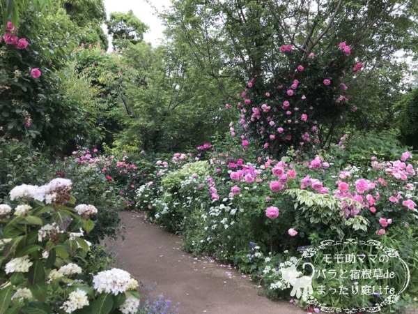右奥の木に絡まってるピンクのバラは、たしかル・ポール・ロマンティーク![]()